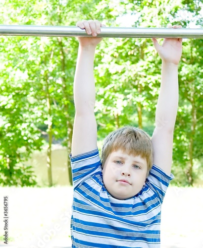 Fototapeta premium A little boy hangs on a horizontal bar in a summer park.