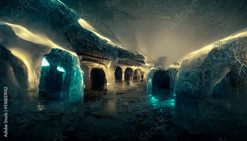 © MiaStendal, Fototapeta premium Abstract ice underground fantasy caves. Rays of light in a dark ice cave. Cold, ice, freshness. Blue neon ice with wet. 3D illustration.