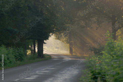 Fototapeta premium Asfaltowa droga wśród drzew w mglisty, letni poranek. Promienie wschodzącego słońca tworzą malownicze smugi w unoszącej się nad jezdni mgłą..