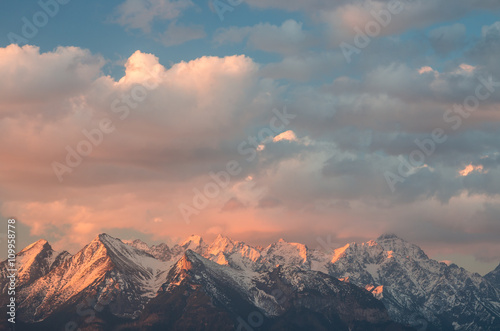 Fototapeta premium Beautiful clouds illuminated by the rising sun over High Tatra mountains covered with snow, Poland