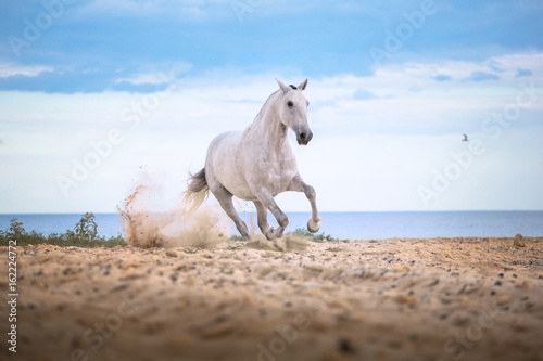 Fototapeta premium Biały koń biegnie na plaży na tle morza i clougs