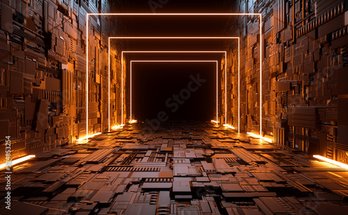© Maipai, Fototapeta premium Electric Sci Fi Orange Neon Light Glowing Tunnel Spaceship Alien Corridor Hallway Passage Illustration Background 3d Rendering