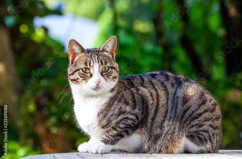 © travelview, Obraz premium ładny kot relaksujący na drewnianym stole w ogrodzie