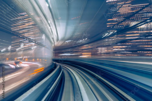 © KenSoftTH, Fototapeta premium Long exposure motion blur from Yurikamome Monorail line in Tokyo, Japan. Abstract for Digital, Technology, Futuristic Transportation, Computer Network, and Communication concept.
