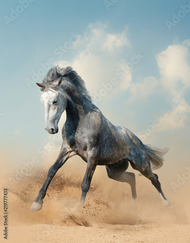 © Mari_art, Obraz premium Młody szary ogier działa na piasku