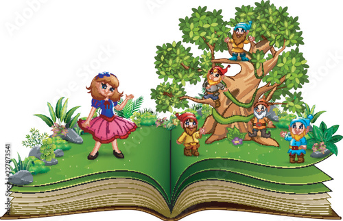 Naklejka premium Otwórz książkę z kreskówką karła na drzewach i śnieżnobiałej