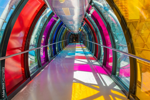© Blazenka, Fototapeta premium Paris, France - July 13th 2022: Futuristic colorful light tunnel walkway, Beaugrenelle shopping mall in Paris, the new interior