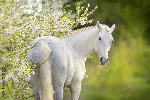 Fototapeta premium Piękny biały koń w wiosennym kwiecie