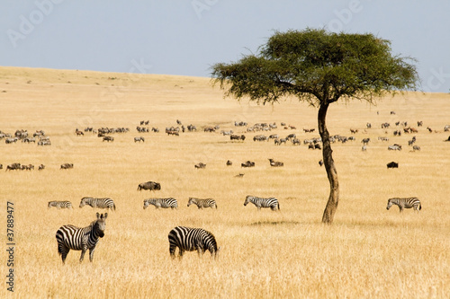© erichon, Fototapeta premium Równiny zebry (Equus quagga) i Gnus w Masai Mara w Kenii