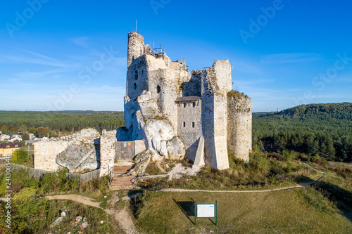 Naklejka premium Ruiny średniowiecznego zamku w Mirowie, Śląsk, Polska, zbudowany w XIV wieku. Jedna z warowni zwanych Orlimi Gniazdami w Polskiej Jurajskiej Wyżynie na Śląsku. Widok z lotu ptaka.