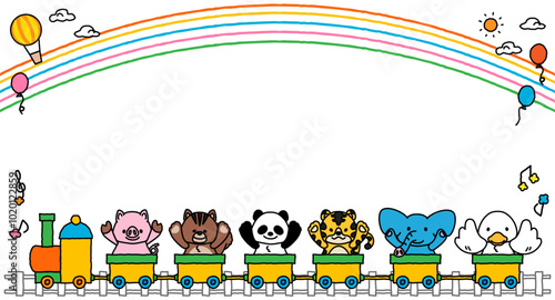 © ribitts, Obraz premium 可愛い動物さんたちが電車に乗ったメッセージフレームA
