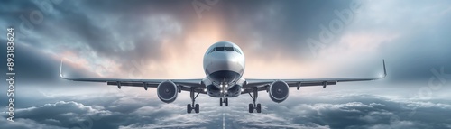 © PhornpimonNutiprapun, Obraz premium A airliner flies high over a foggy sky.
