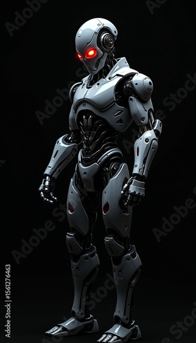 © tanmoy, Naklejka premium A angry ai robot with glowing eyes that seem to pierce through the darkness, A robot with glowing red eyes standing in darkness, AI generated