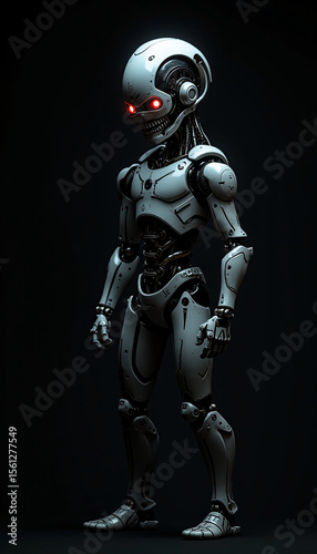 © tanmoy, Naklejka premium A angry ai robot with glowing eyes that seem to pierce through the darkness, A robot with glowing red eyes standing in darkness, AI generated