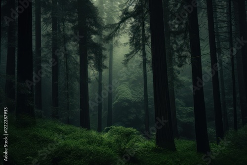 Naklejka premium A asian forest with tall dark green trees nature woodland outdoors.