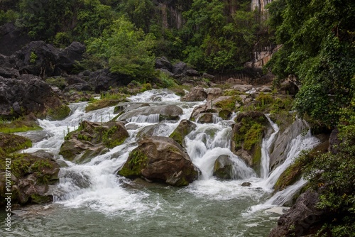 Fototapeta premium A babbling brook flows through a lush green mountain valley.