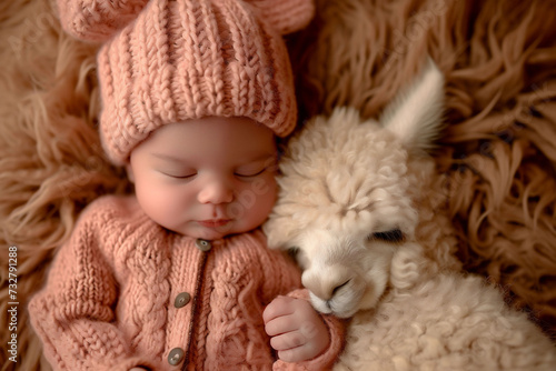 © Silga, Fototapeta premium A baby, adorned in a soft pink knitted hat and sweater, shares a tender moment with a alpaca, highlighting a nurturing theme.