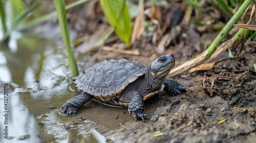 © Samady, Obraz premium A baby alligator snapping turtle resting on a riverbank