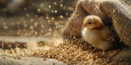 Obraz premium A baby chick is sitting on a bag of grain