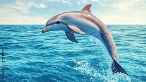 Naklejka premium A baby dolphin jumping out of turquoise water, its sleek body glistening, with a soft focus on the ocean horizon.