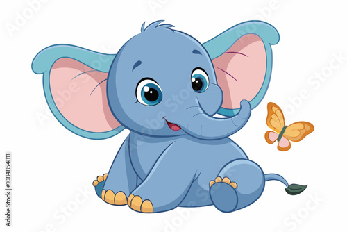 Fototapeta premium A baby elephant sitting in cute pose, with butterfly, on white background