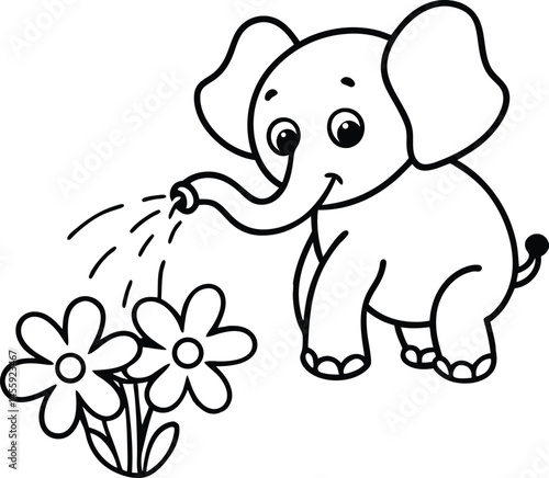 © illustration clipart, Fototapeta premium A baby elephant spraying water from its trunk coloring page.