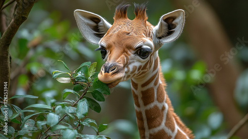 © tong2530, Obraz premium A baby giraffe curiously reaching for leaves on a low-hanging tree branch