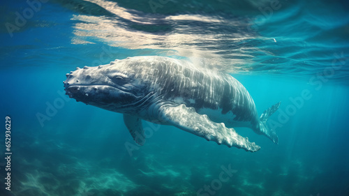 © LomaPari2021, Naklejka premium A Baby Humpback Whale Plays Near the Surface in Blue Water generative ai