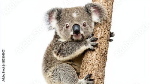 © กาซือมะ สาและ, Naklejka premium A baby koala climbing a eucalyptus tree, with a sleepy expression, on a white isolated background