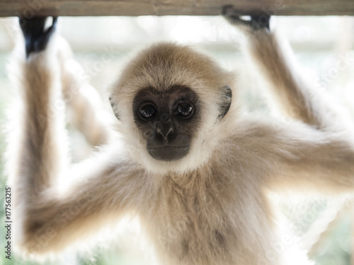 © Iuliia, Naklejka premium A baby lar gibbon ape, Hylobates lar, has rose his hands and is looking at camera. A young monkey has big dark expressive eyes, childly-looking snout and attractive white hair