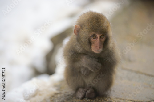 © northtail, Naklejka premium A baby monkey shivering in snowy field