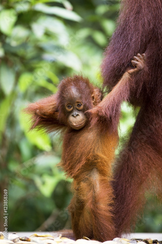 Fototapeta premium A baby orang-utan staying close to its mother in their native habitat. Rainforest of Borneo.