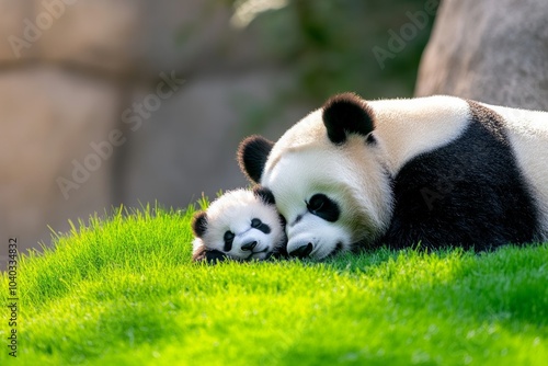 © Natalia, Fototapeta premium A baby panda and its companion resting peacefully on green grass in warm daylight