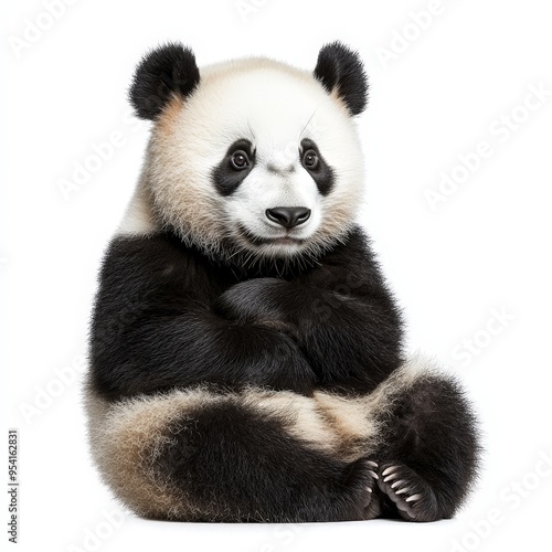 © TheosArtTavern, Fototapeta premium A baby panda is sitting on its back legs and looking at the camera