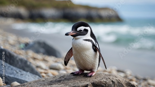 Fototapeta premium A baby penguin standing on a rock near the shoreline. Wildlife and animals,...