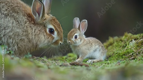 © Samady, Fototapeta premium A baby rabbit nibbling on grass beside its mother