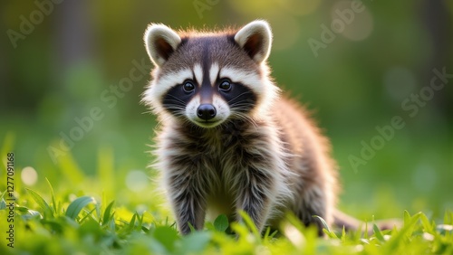 Fototapeta premium A baby raccoon stands on green grass with a blurred natural background.