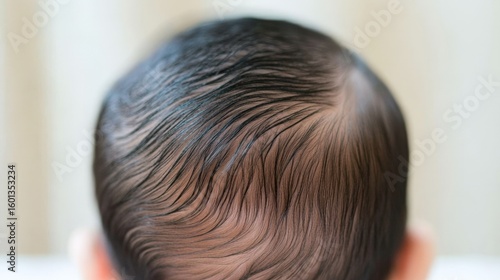 © StasySin, Fototapeta premium A baby's head with a bald spot on the top.