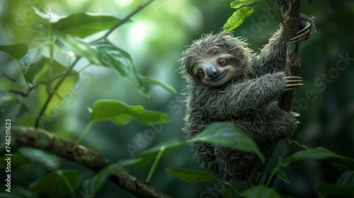 Fototapeta premium A baby sloth hanging from a tree branch, its tiny, curious eyes peeking out from a fuzzy face, the epitome of slow-moving cuteness, set against the lush backdrop AI Generative