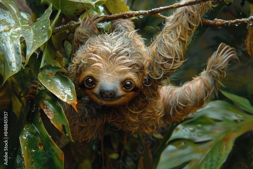 © Nico, Obraz premium A baby sloth hanging upside down from a tree branch, with a slow and content expression. The background shows a tropical rainforest