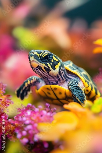 © Dibos, Obraz premium A baby turtle with black and yellow stripes is moving through the colorful plants, blur background