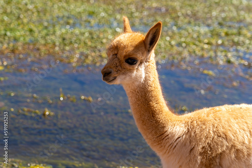 © JHVEPhoto, Obraz premium A baby vicuna at the edge of the water near San Pedro de Atacama, Chile. The vicuna (Lama vicugna) is one of the two wild South American camelids.
