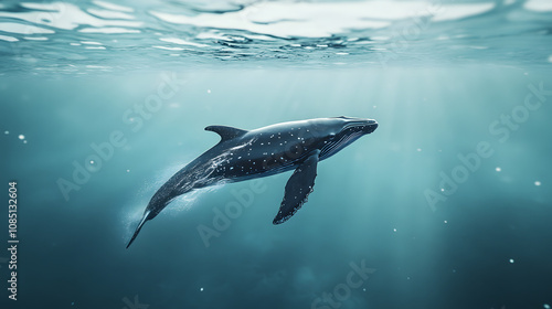 Fototapeta premium A baby whale breaching the surface of the ocean with its mother, practicing swimming skills.