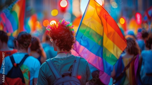 © Saowanee, Obraz premium A back view captures people protesting on the street, proudly waving LGBT and Trans flags. The vibrant colors of the flags stand out, symbolizing solidarity and the fight for equality and rights