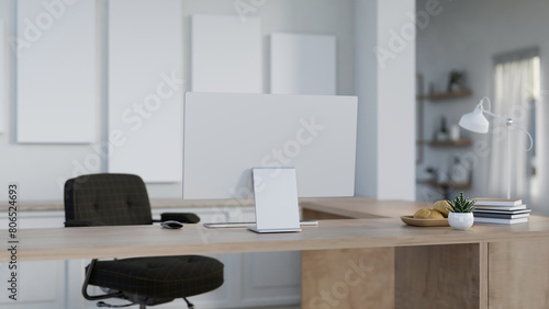 Fototapeta premium A back view image of a computer desk in a contemporary home office or private office.