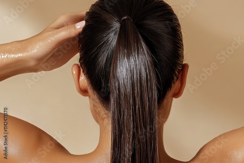 Fototapeta premium A back view of a woman showcasing her glossy, wet hairstyle pulled into a neat ponytail, capturing the essence of elegance and style with a minimalistic background.
