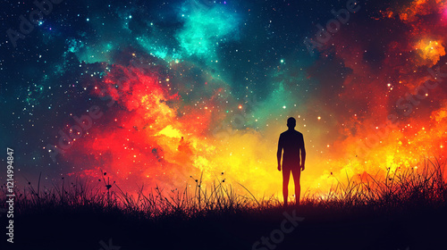 © Your Hand Please, Fototapeta premium A back view silhouette of a man in a space concept background, highlighting the universe, astronomy, and the night sky, with abstract and minimalistic elements, bright tones, and a blurred cosmic atmo