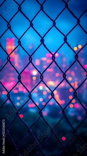 © Pascal, Fototapeta premium A background of a chain-link fence with blurred city lights in the distance.