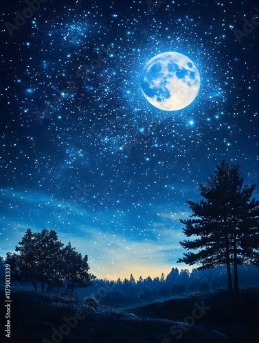 © PSCL RDL, Naklejka premium A background of a starry night sky with a bright full moon and constellations.