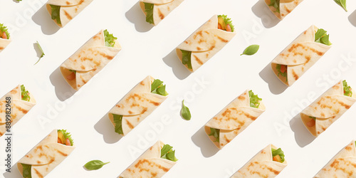 Fototapeta premium A background of burritos, each with its shadow, scattered across the canvas in an elegant display, with soft shadows on a white background